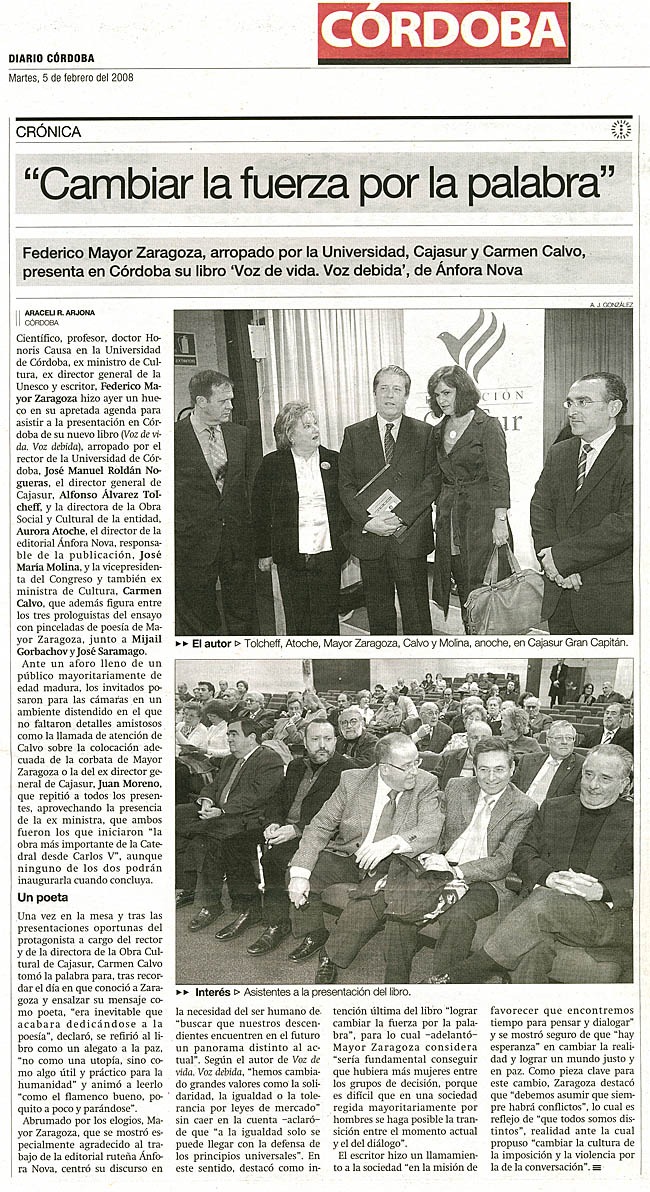 Francisco Mayor Zaragoza, arropado por la Universidad, Cajasur y Carmen Calvo, presenta en Córdoba su libro "Voz de vida, Voz debida", de Ánfora Nova