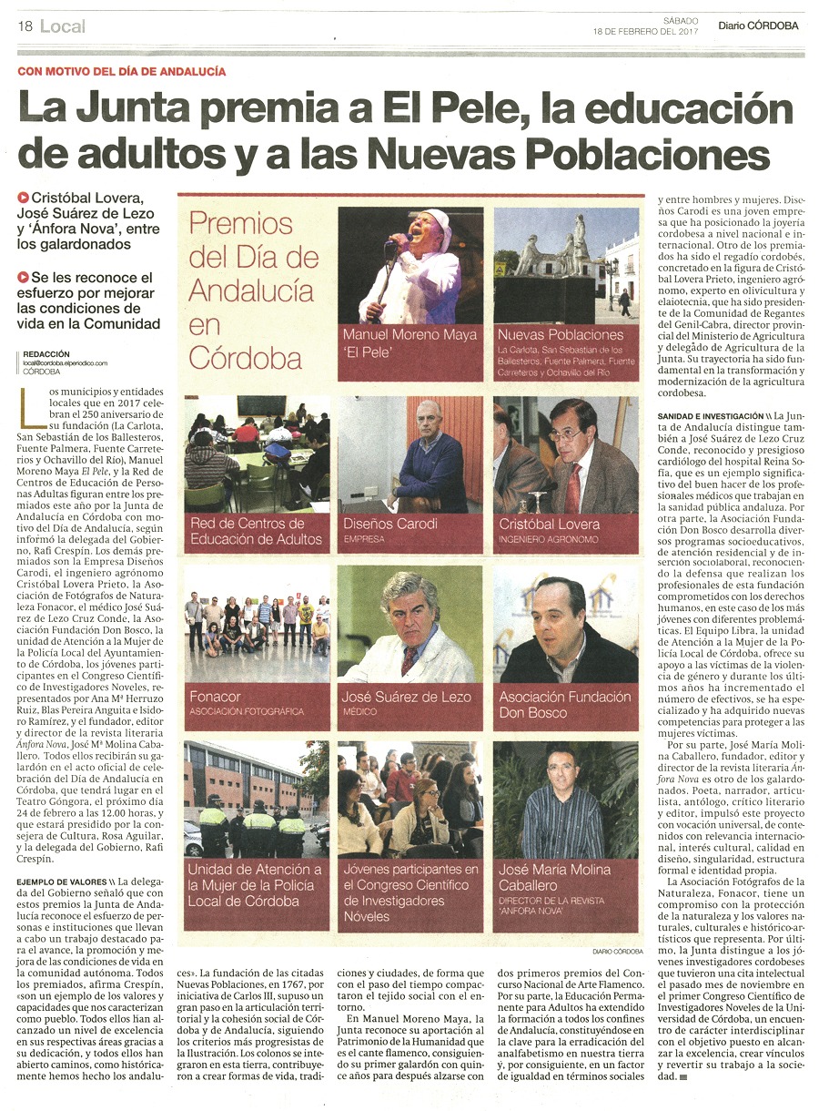 La Junta premia a El Pele, la educación de adultos y a las Nueva Poblaciones