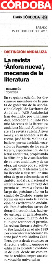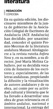 La Revista Literaria y Editorial ÁNFORA NOVA fue galardonada por el Consejo de Gobierno de la Junta de Andalucía con la